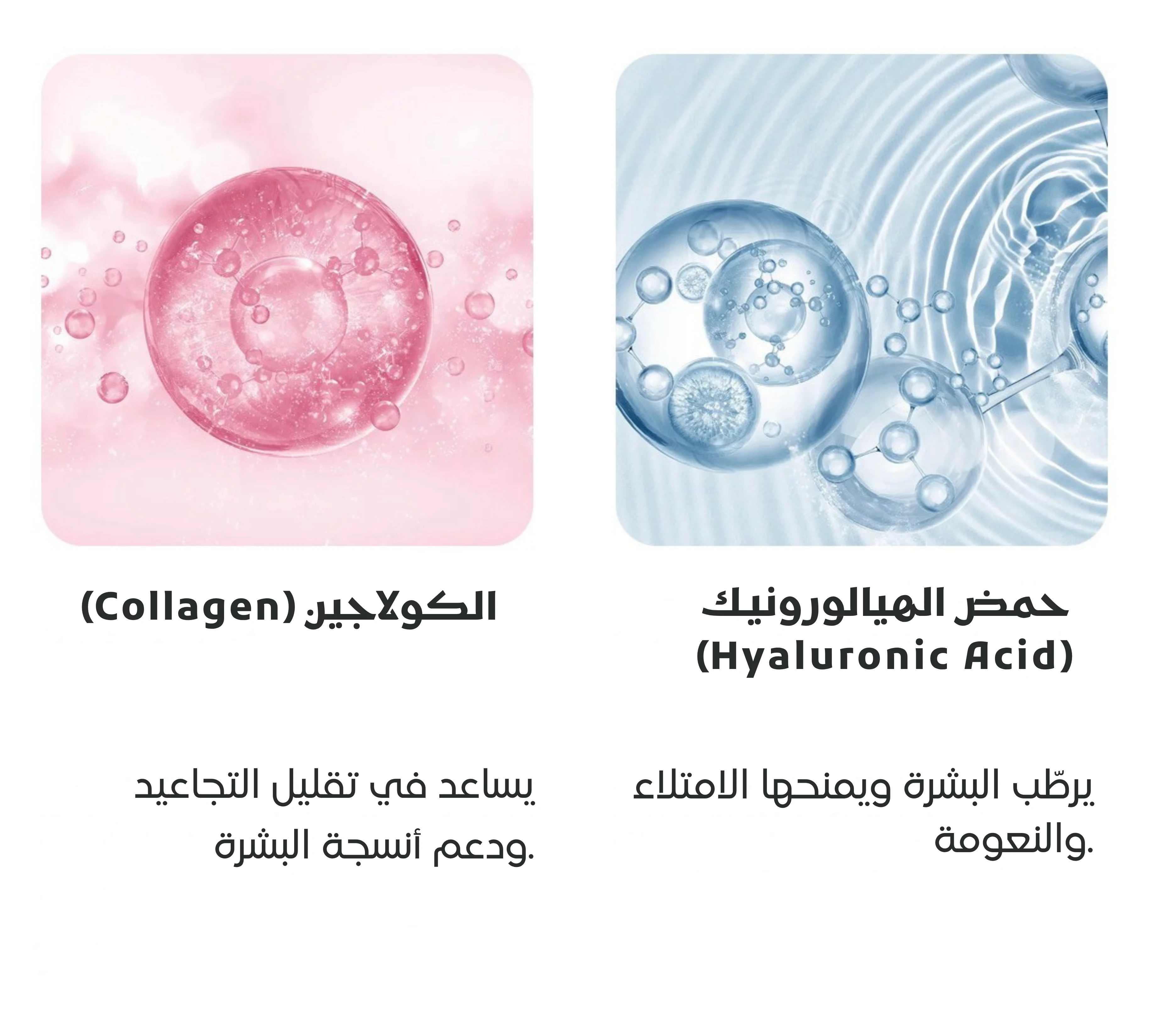 الكولاجين: يعزّز مرونة الجلد وشدّه، يقلل مظهر التجاعيد والخطوط الدقيقة.