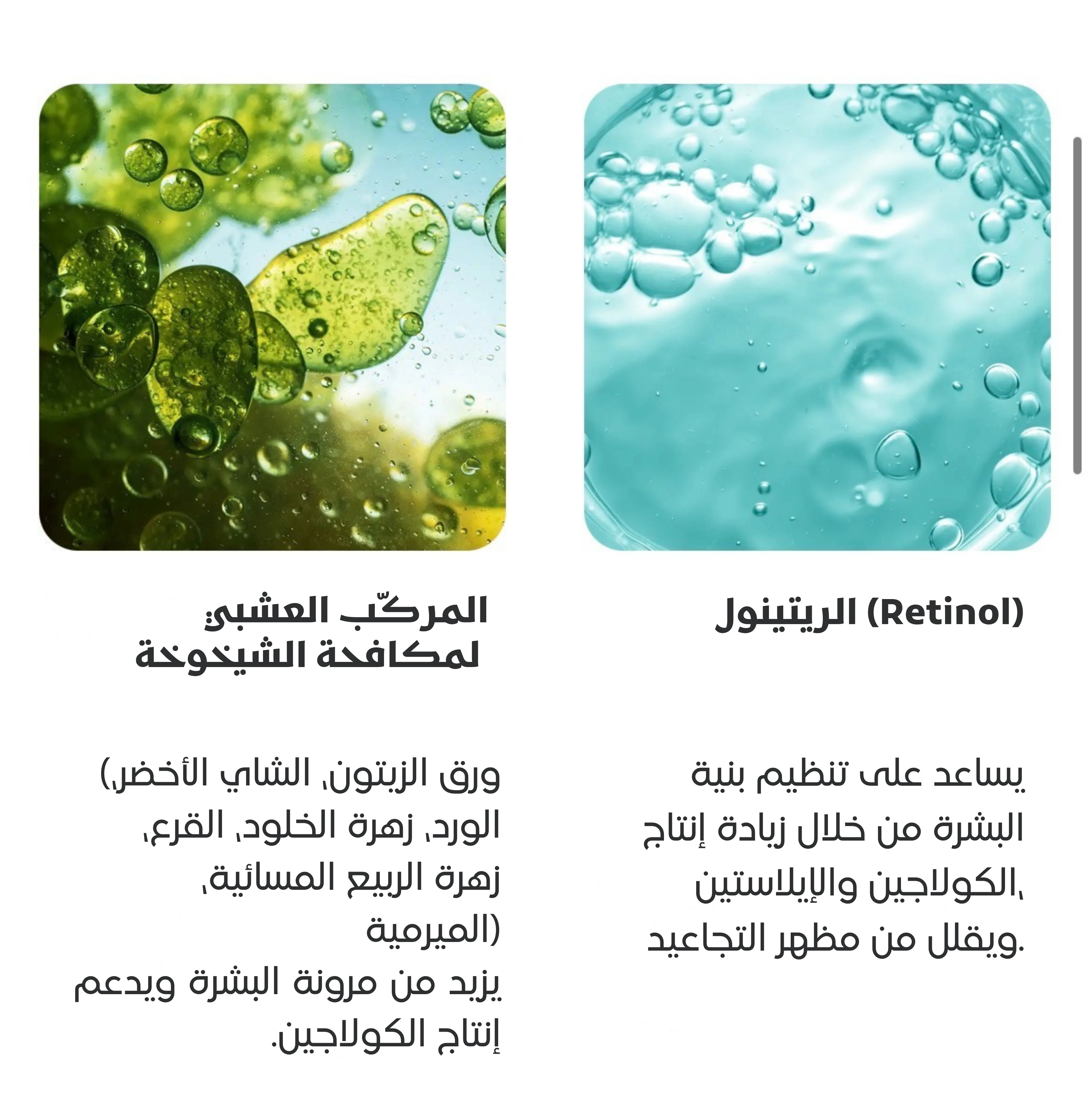 • يحتوي على 20% ريتينول + كولاجين + حمض هيالورونيك ومستخلصات نباتية.