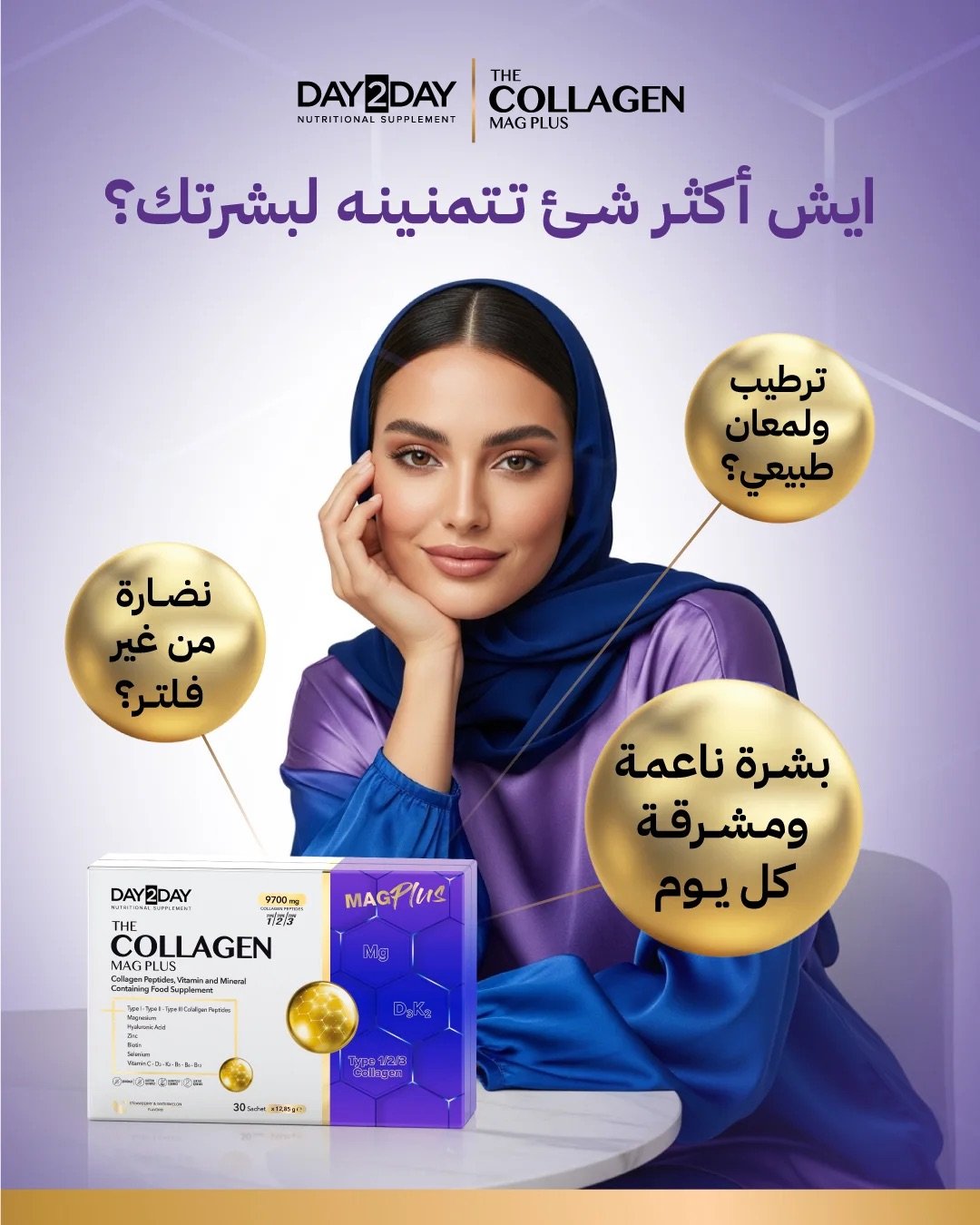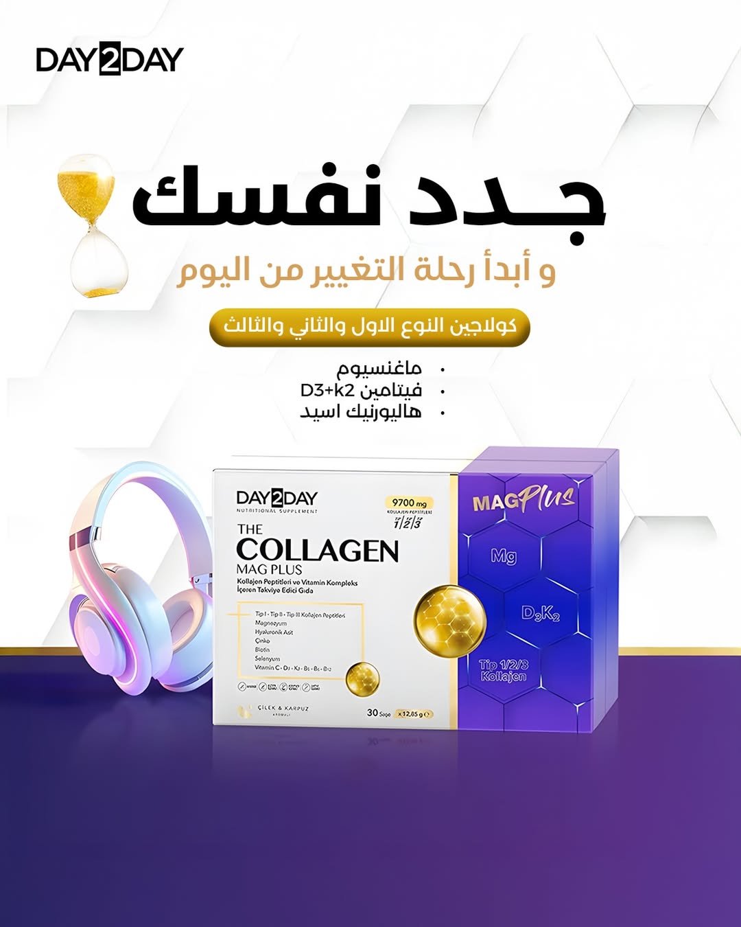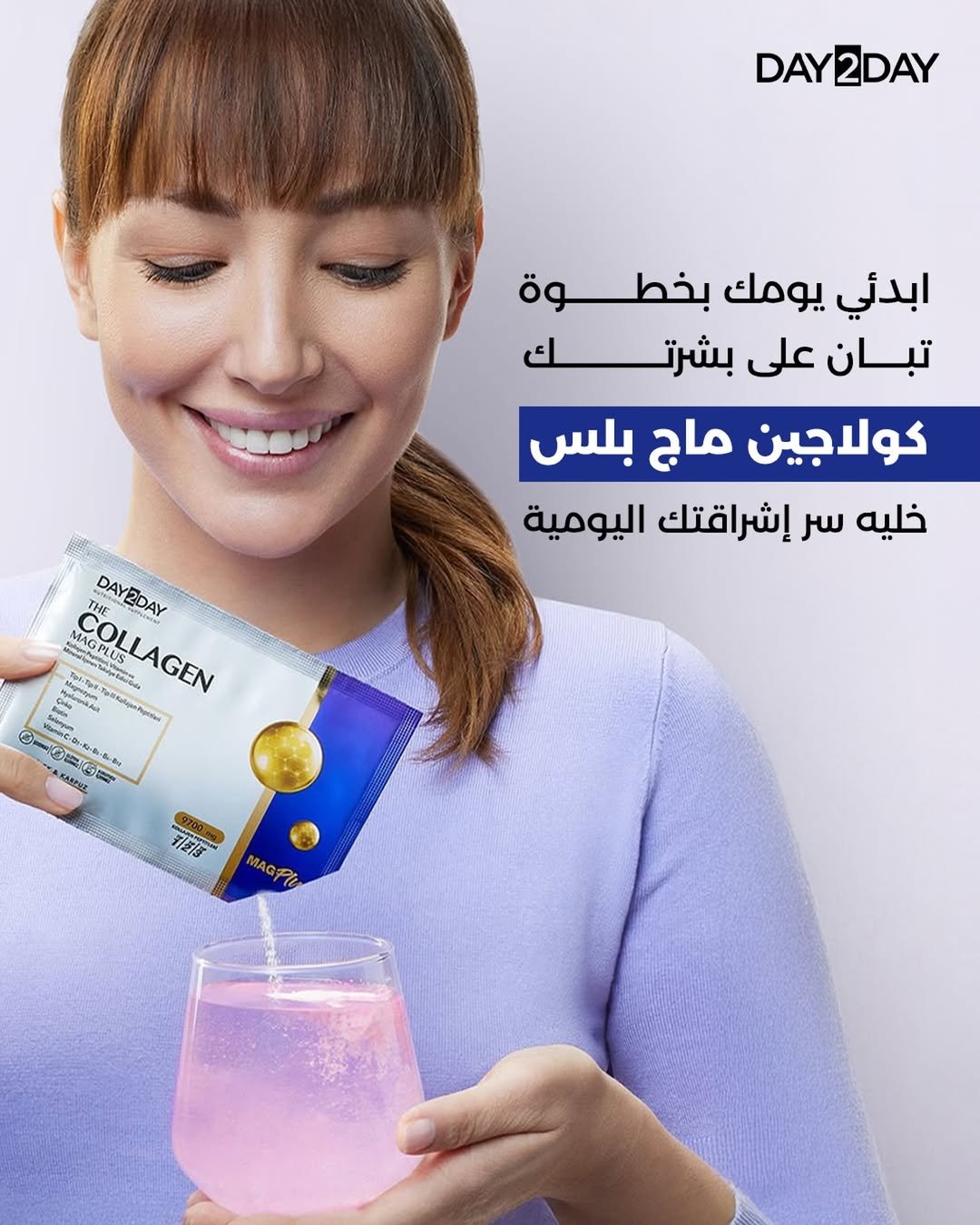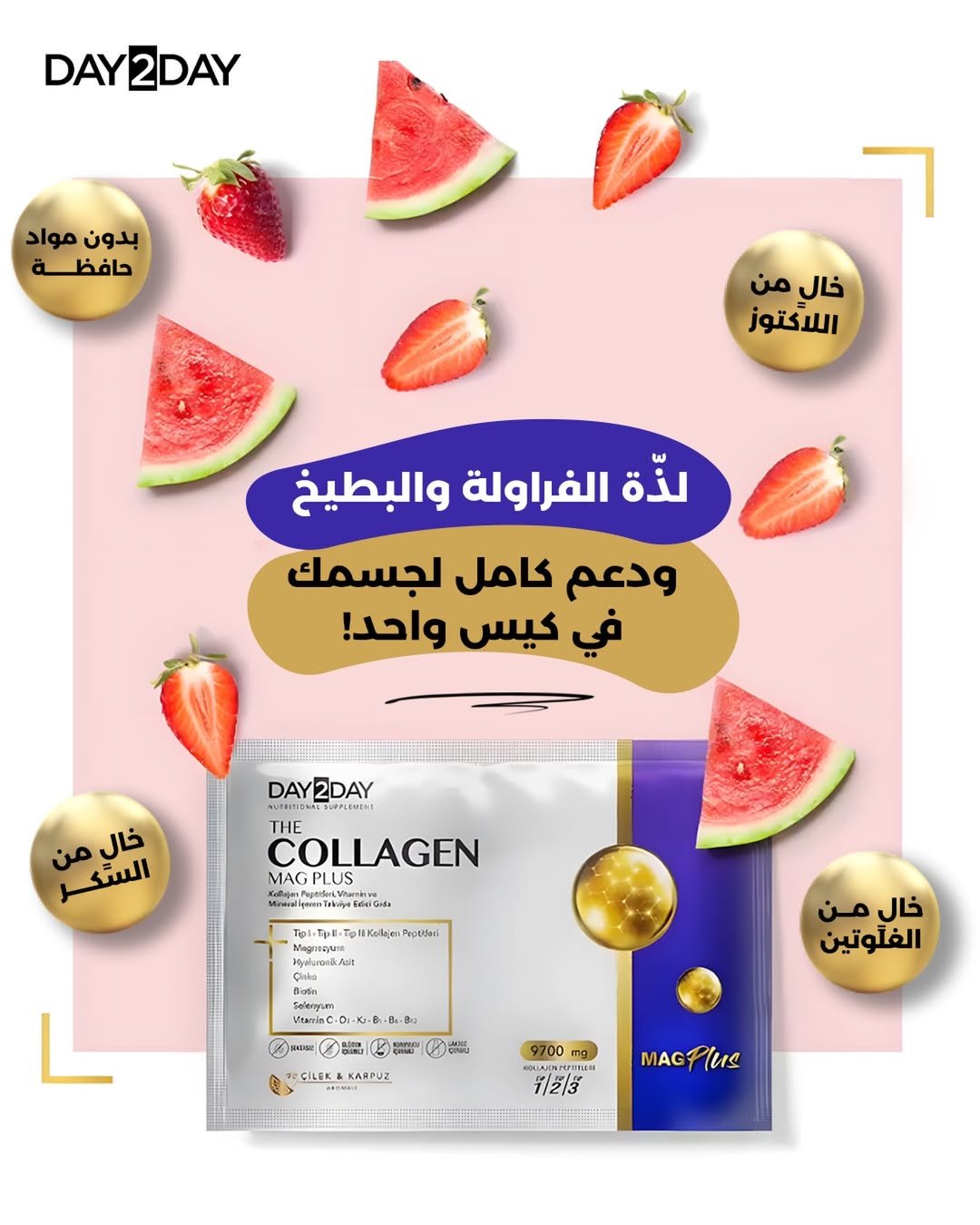 Day2Day The Collagen Mag Plus هو مكمل غذائي في شكل ساشيه (مسحوق للخلط) يجمع بين ببتيدات كولاجين من النوع I / II / IIIو مزيج من الفيتامينات والمعادن + حمض الهيالورونيك + مغنيسيوم, لتقديم دعم شامل للبشرة، الشعر، المفاصل، والعظام.
